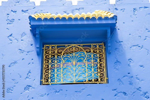 Małe okienko z rzeźbioną kratą i daszkiem w stylu śródziemnomorskim