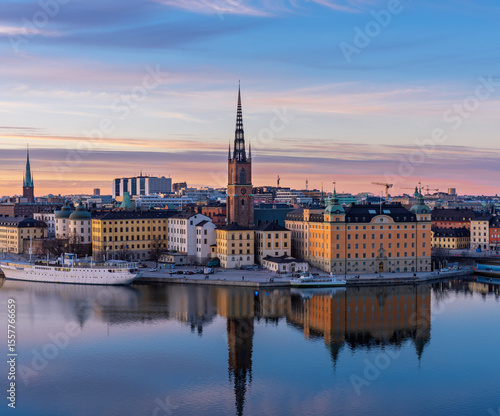 Sunset cityscape of Stockholm with Riddarholmen and Old Town waterfront