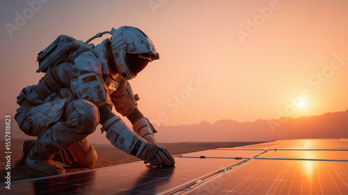 Astronaut in Wüstenszenerie mit Solarpanels bei Sonnenuntergang. Künstliche Intelligenz KI