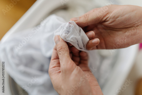 Top view of male hands examining white clothing, checking fabric surface for potential staining before soaking in washing basin, close-up. Concept of domestic work, housekeeping and household.