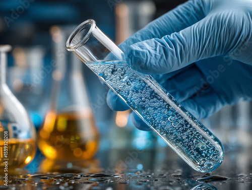 Dłoń w niebieskiej rękawiczce laboratoryjnej trzyma probówkę z bulgoczącym, przezroczystym płynem. W tle widać kolby, sugerując badania chemiczne.