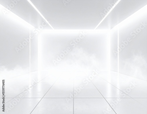 Białe, puste wnętrze oświetlone przez świecące listwy z kłębiącym się dymem lub mgłą