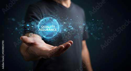 Hand Holding Global Quality Assurance Network Interface – Data Integration, System Performance Monitoring, QA Testing, Compliance, Technology Concept Video