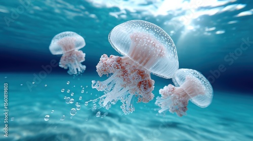 Vibrant Underwater Scene Featu Multiple Jellyfish Swimming with Transparent Bell Shapes and Long Tentacles in Clear Ocean Water