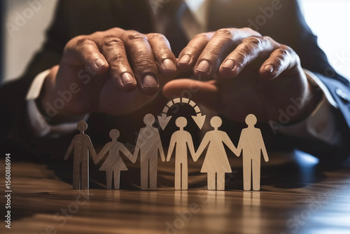 Protecting family: A business person shields wood cutout people holding hands, symbolizing support, protection, and continuity of care.