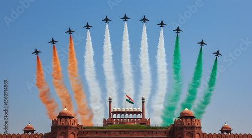 Airshow jet smoke trail sky celebration parade flag india republic day independence day air force flight spectacle fort aircraft