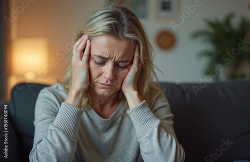 Sad caucasian woman tired at home sitting on couch. Concerned about domestic problems. Depressed female suffers from headache stress emotional pain anxiety loneliness.