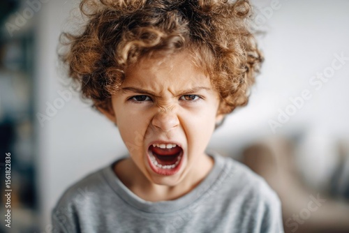 Angry curly boy screaming with mouth wide open, face expressing anger and indignation, strong emotions, concept of stress in children