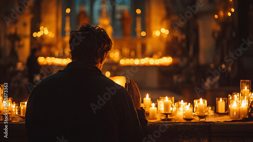Silhouette of a Person Attending a Solemn, Candlelit Vigil or Prayer Service in a Dark Church.