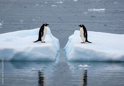 Two penguins standing on separate ice floes. Separated by a narrow crack in the melting ice. Natural Antarctic landscape with soft lighting