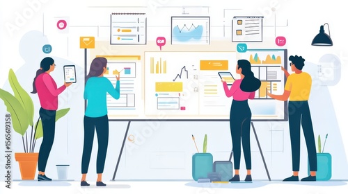 Team members collaborating on a large interactive whiteboard.