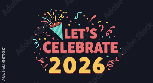 Let's Celebrate 2026. New Year greeting card with party popper and confetti. Festive vector illustration for holiday invitation or banner.