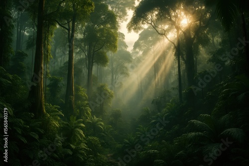 Mysterious tropical rainforest with dense canopy ancient trees and filtered sunlight creating atmospheric jungle adventure setting