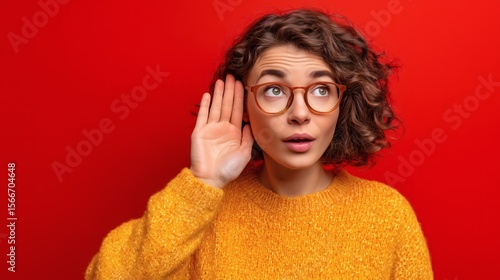 Femme écoutant attentivement main à l’oreille geste communication audition fond rouge portrait