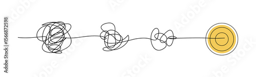 Continuous one line drawing of chaos tangle which gradually turns into achievement target, problem solving concept, trouble solution, brainstorming process