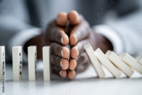 Hands stopping dominoes from colliding symbolizing conflict prevention, mediation, and resolution of disputes