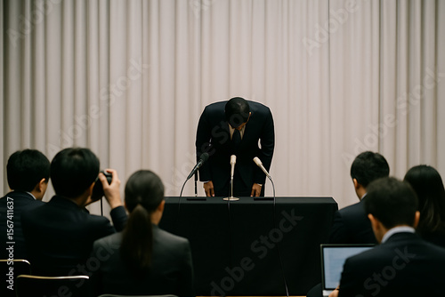謝罪会見で頭を下げる男性と報道陣の全景ショット