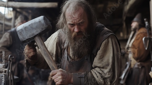 A rugged man with a beard focused on forging metal, showcasing craftsmanship in a traditional workshop setting. Medieval shot.