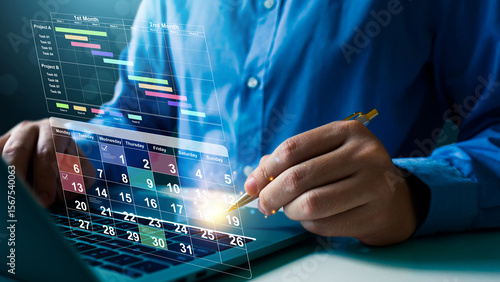 Businessman sitting with laptop on work calendar, Planning and Scheduling Calendar of meetings, events and activities Time management Notifications and reminders of important events.