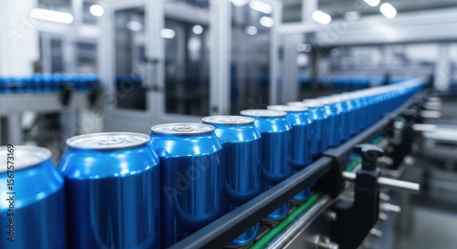 Shiny blue aluminum beverage cans moving on a high tech factory production line