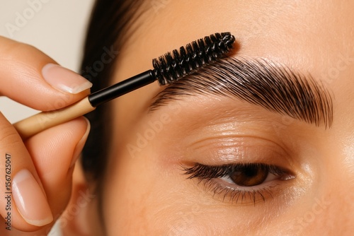 close-up of female hand brushing eyebrow upward with spoolie brush during lamination process, macro shot