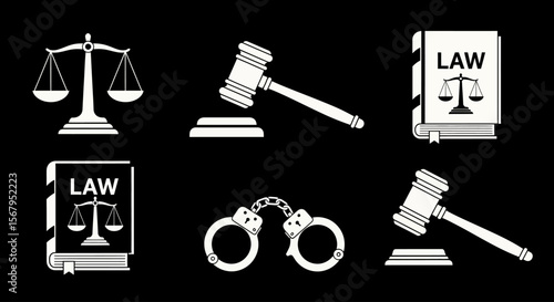 Simple, black and white icons representing legal concepts like scales of justice, gavel, and law books.