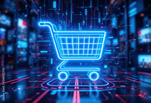 Ícono de carrito de compras de neón, interfaz de comercio digital, flujos de datos brillantes, entorno de comercio minorista cibernético, fondo abstracto de alta tecnología