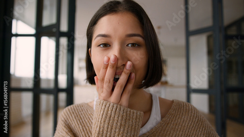 POV webcam point of view female girl addict influencer Caucasian smiling woman happy surprised read message online chatting using mobile phone touchscreen typing sms cellphone gadget screen at home