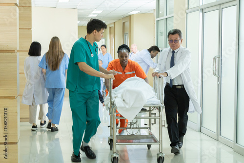 Hospital, healthcare, medical, doctor, nurse staff transports patient on gurney down hospital corridor, coordinating fast response with skilled teamwork in multiracial emergency care illness situation