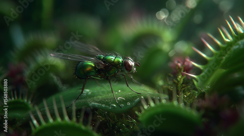 Makro zdjęcie błyszczącej, zielonej muchy na liściu muchołówki, z widocznymi kroplami rosy. Fascynujący świat natury i drapieżnych roślin.