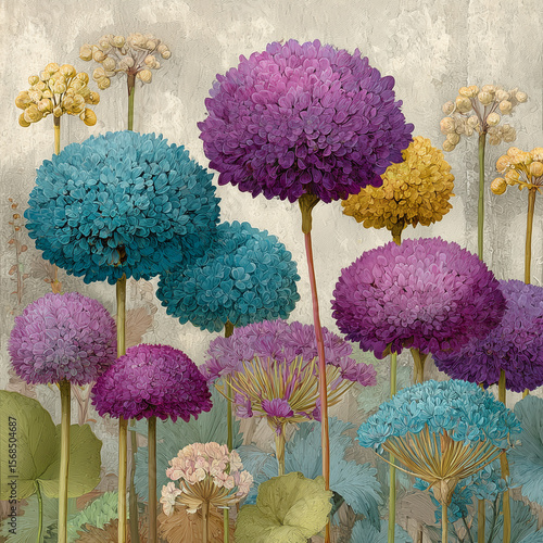 Malarstwo przedstawiające stylizowane, sferyczne kwiaty w intensywnych barwach: turkus, fiolet i żółć. Abstrakcyjny ogród pełen fantazji.