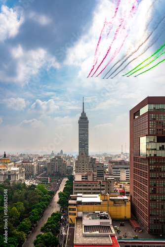 Air show with colored smoke during Mexico’s Independence Day parade on September 16 in downtown Mexico City with Torre Latinoamericana