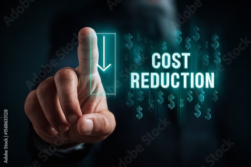 Businessman pressing button for cost reduction strategy during financial planning session in modern office