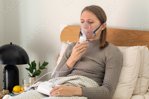 Woman using nebulizer at home for respiratory treatment and health care
