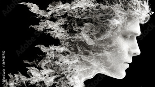 This artwork depicts the abstraction of a human face merging with swirling smoke, conveying themes of anger, transformation and fluidity. The ethereal forms suggest movement and change