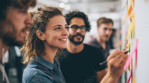 #799807151Happy young woman writing ideas on colorful sticky notes in a collaborative workspace with smiling coworkers in the background during a productive team meeting