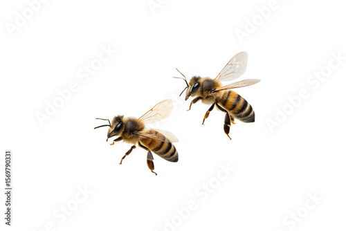 Two honey bees flying with wings spread and legs extended in flight, isolated on a transparent background