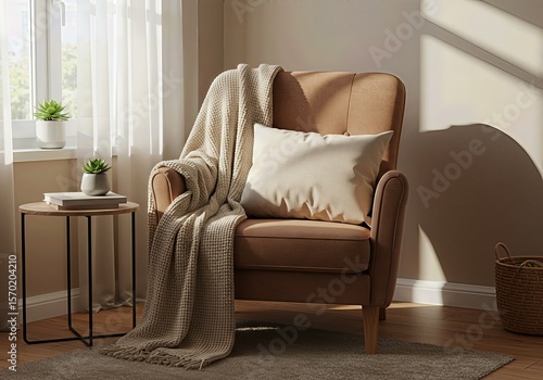 Cozy living room interior with a comfortable armchair and blanket in warm sunlight, representing home comfort and relaxation