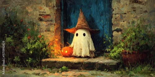 Spooky Season: Ghost in Witch Hat with Pumpkin by Rustic Door - Oil Painting Style