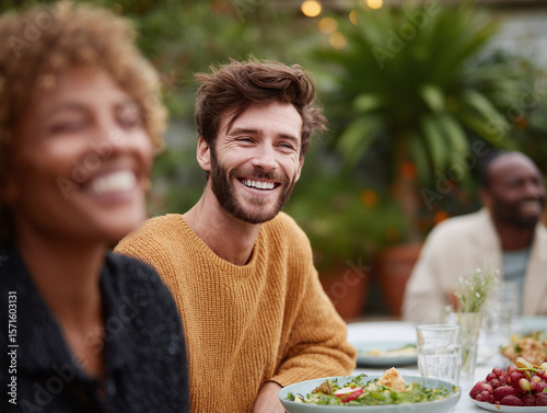 Friends gather outdoors for a meal, radiating joy and connection. Captures shared laughter and convivial moments. Perfect for lifestyle, food, or social event campaigns.