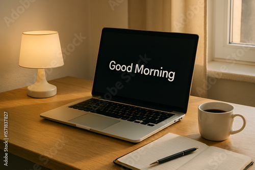 Poranny widok na biurko z laptopem, filiżanką kawy i napisem "Good Morning" – inspiracja na dobry początek dnia
