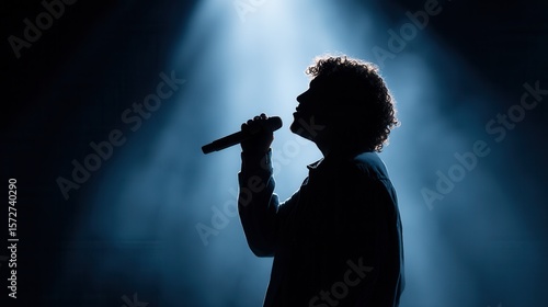 Silhouette of male singer with microphone in dramatic stage lighting.