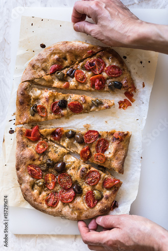 mani femminili che porgono fettine di pizza al pomodoro, olive e origano