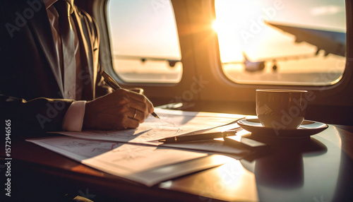 Biznesmen pracujący przy dokumentach w samolocie - wyjazd służbowy delegacja