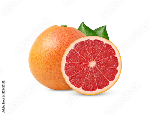 Whole grapefruit and cut in a slice isolated with green leaf.