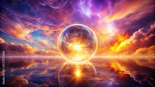 A radiant aura surrounds a luminous sphere as it bursts into existence amidst swirling clouds of purple and orange hues