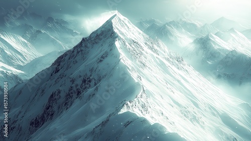 Snowy mountain peak, winter landscape, aerial view, sunlight, travel