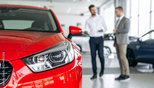 Front View of Headlight on Beautiful Red Sports Car Automobile with Male Customer Choosing Vehicle at Dealership for Luxury Auto Purchase Concept