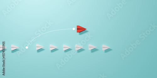 A red paper plane turns forward and overtakes a white paper plane on a light blue background, symbolizing leadership, innovation and divergent thinking.