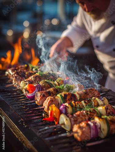 A chef skillfully grilling skewers with marinated meat and vibrant vegetables, showcasing the art of barbecue cooking and the appeal of delicious food preparation.